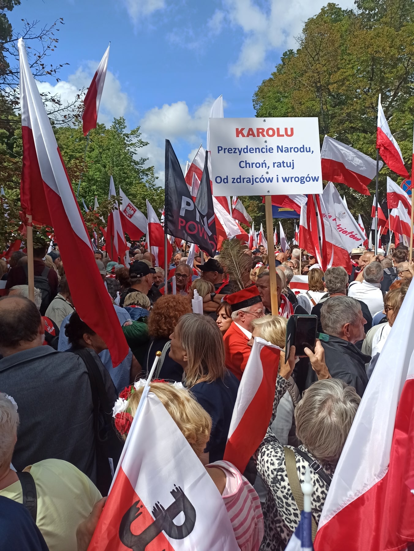 Przed Sejmem zobaczyłem morze biało-czerwonych flag. Wielu niosło banery: „Karol Nawrocki – prezydentem Polski”, „My chcemy Boga w pracy, w polityce, w szkole” czy „Karolu Prezydencie Narodu, chroń, ratuj od zdrajców i wrogów”. Nie brakowało też symboli Solidarności, klubów „Gazety Polskiej” i Ruchu Obrony Granic. Zgromadzenie otwarto odśpiewaniem Roty i wspólną modlitwą różańcową za nowego prezydenta. W powietrzu unosiła się radość i nadzieja – uczestnicy od pierwszych minut skandowali: